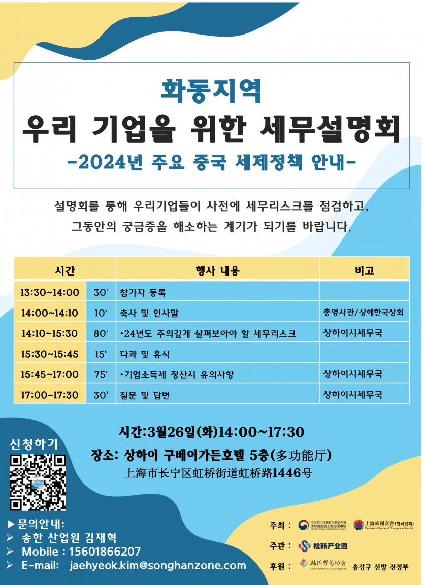어려운 여건 속에서 경영활동을 펼치고 있는 우리기업들을 지원하기 위해 주상하이대한민국총영사관과 상해한국상회가 2024년 3월 26일 「우리기업을 위한 세무설명회」를 개최하고자 합니다. 특별히 이번 설명회는 상하이시 세무국 기업소득세 및 리스크관리 담당자들이 직접 강연과 질의응답을 통해 우리기업의 궁금증과 애로사항에 대해 답변해 줄 예정입니다. 설명회를 통해 우리기업들이 사전에 세무리스크를 점검하고, 그동안의 궁금증을 해소하는 계기가 되기를 바랍니다. 많은 참석과 관심을 부탁드립니다.