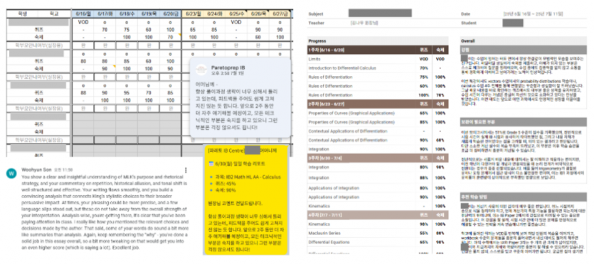 개인정보라 일부러 다소 흐릿하게 올립니다. 학원에서 나가는 다양한 종류의 피드백입니다.