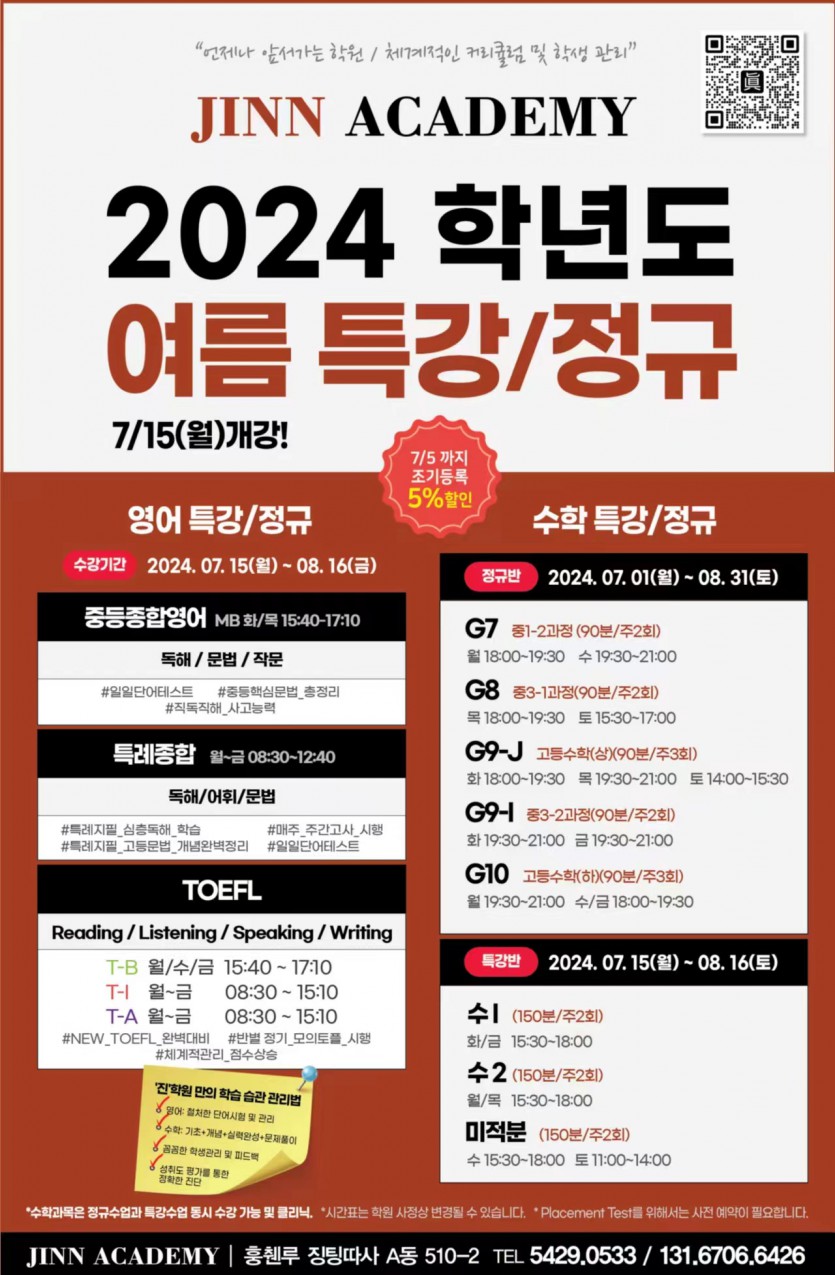 JINN ACADEMY: 2024 여름방학 영어, 수학 특강/정규 안내문입니다~!