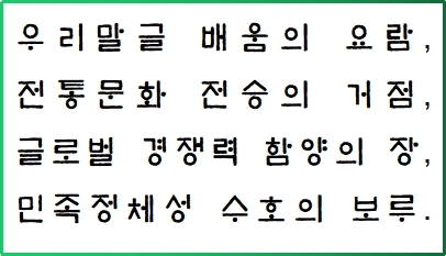 수업내용: 한국어 말하기, 듣기 등; 예의범절, 동요 동시, 노래와 춤 등.