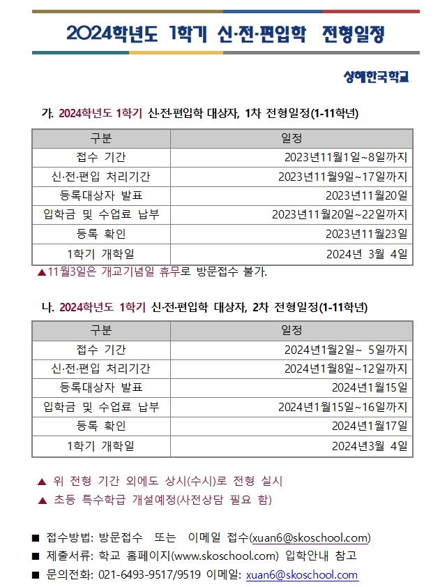 상해한국학교 2024학년도 1학기 신.전.편입 전형일정 및 접수방법